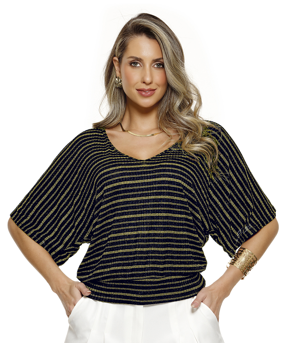Malha de viscose com fios dourados. Malha leve, toque suave e bem macio.