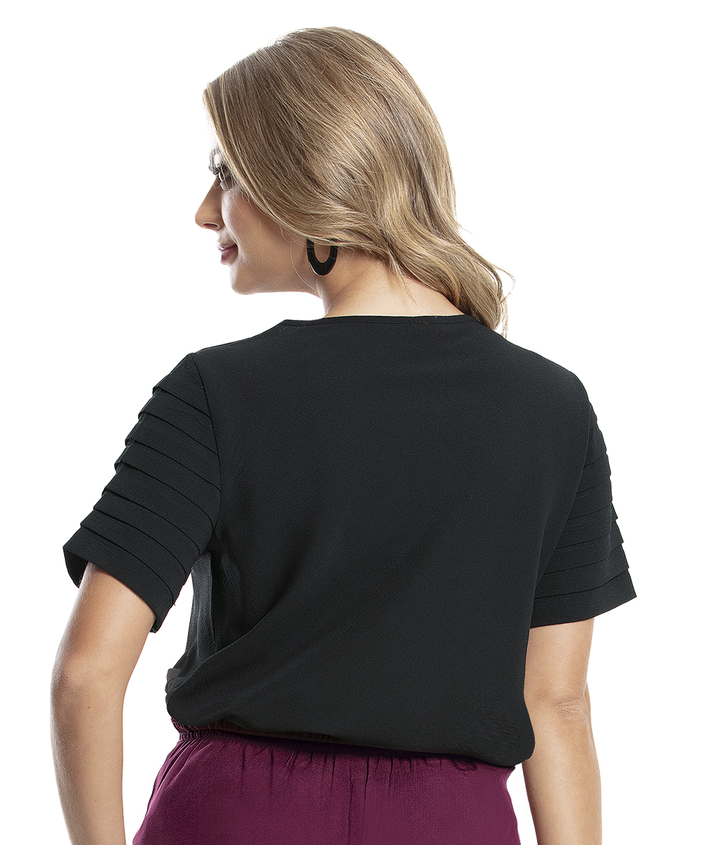 Blusa decote redondo, mangas curtas com pregas, detalhe de botões aplicado