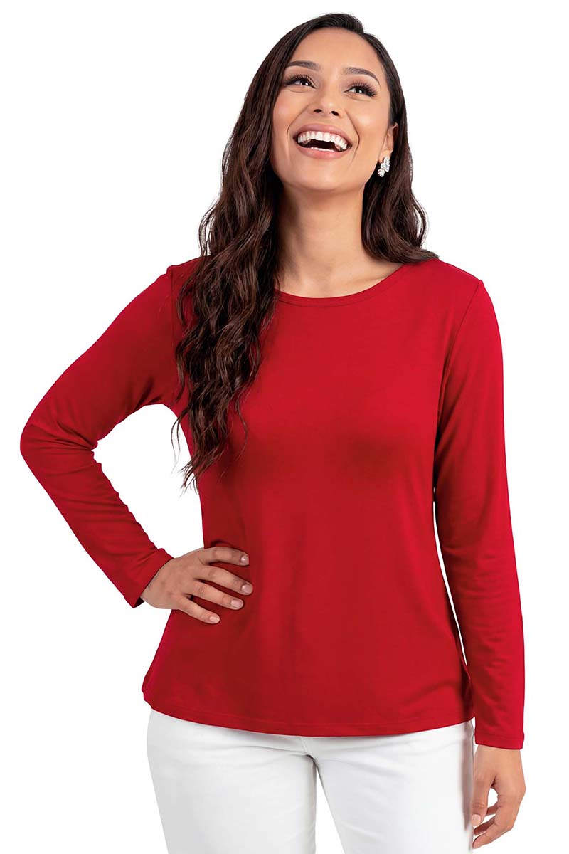 Viscose com elastano. Toque leve e macio. Ótimo caimento e muito conforto
