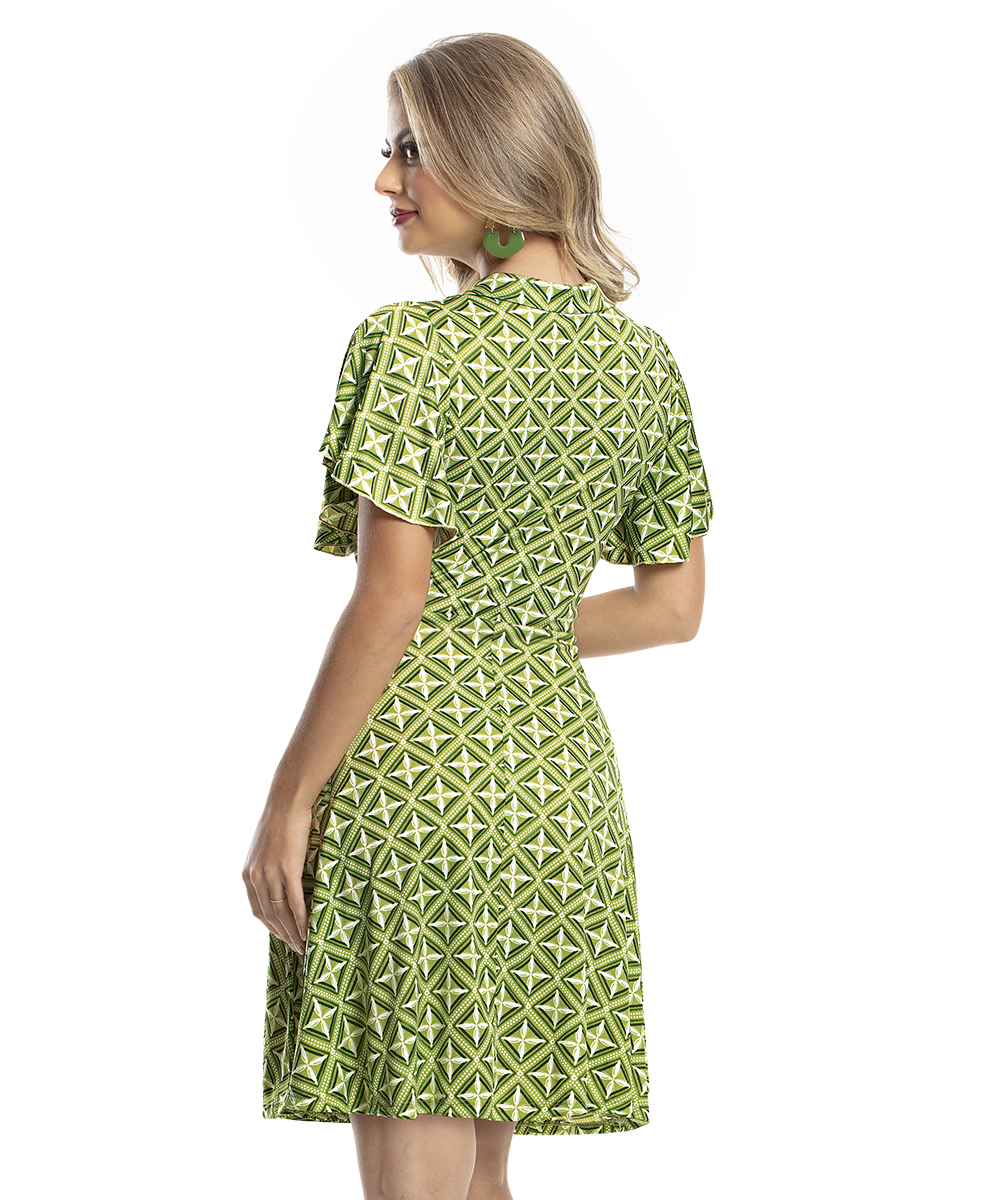 Vestido decote transpassado com gola, busto forrado, mangas curtas godês,