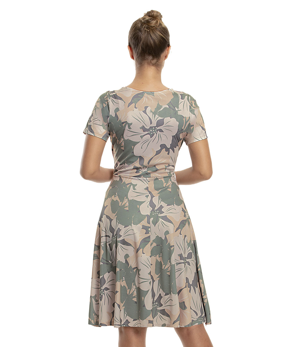 Vestido com decote transpassado, mangas curtas, faixa ambutida na cintura.