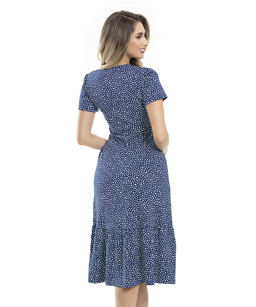 Vestido decote transpassado, mangas curtas. Modelagem da saia evasê com