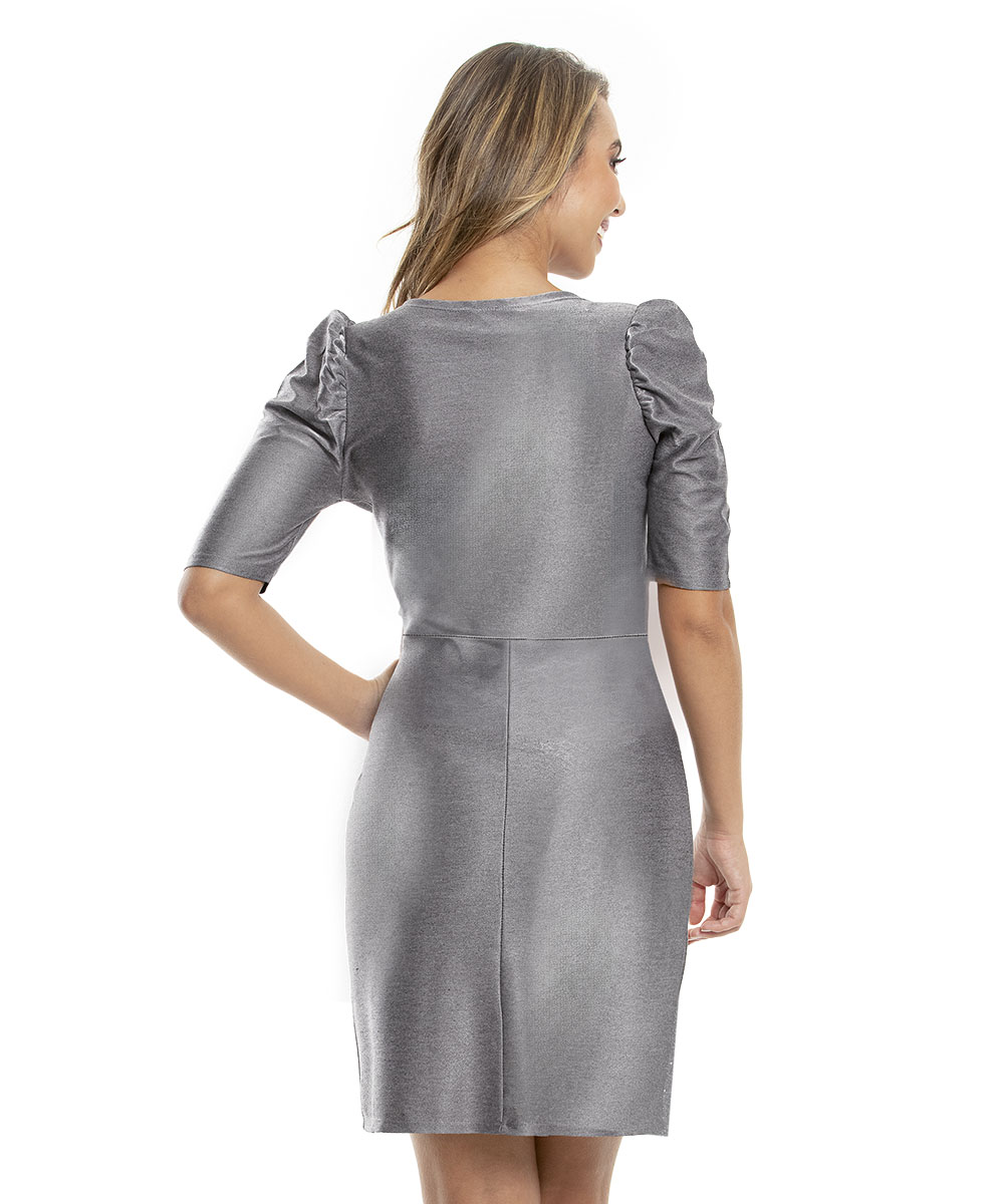 Vestido decote com transpasse, mangas na dobra do braço bufantes,