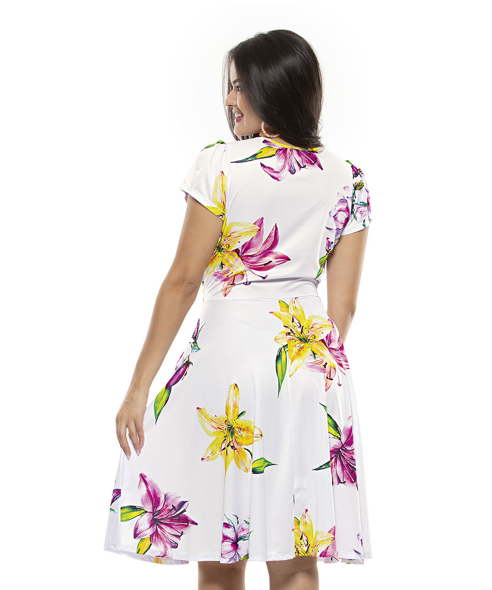 Vestido com decote princesa, mangas curtas, faixa embutida na cintura