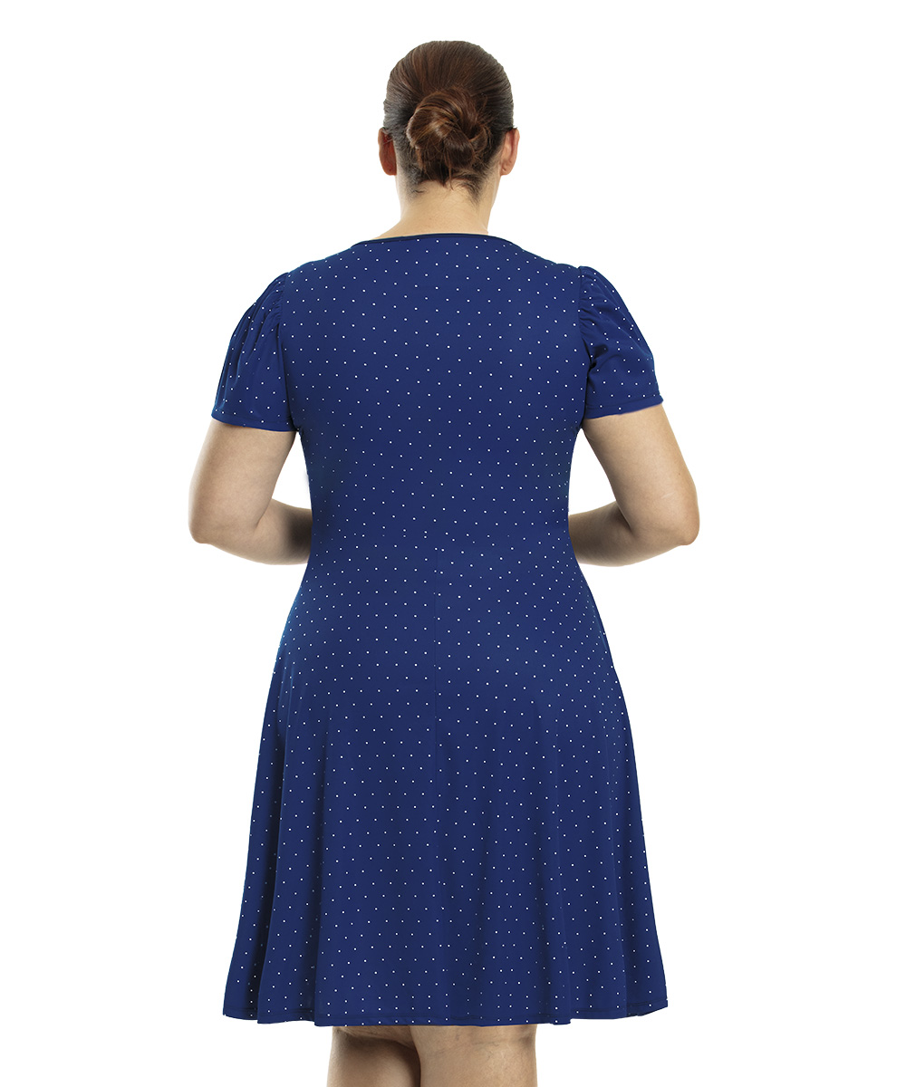 Vestido decote redondo possui pala contrastante com abertura discreta,