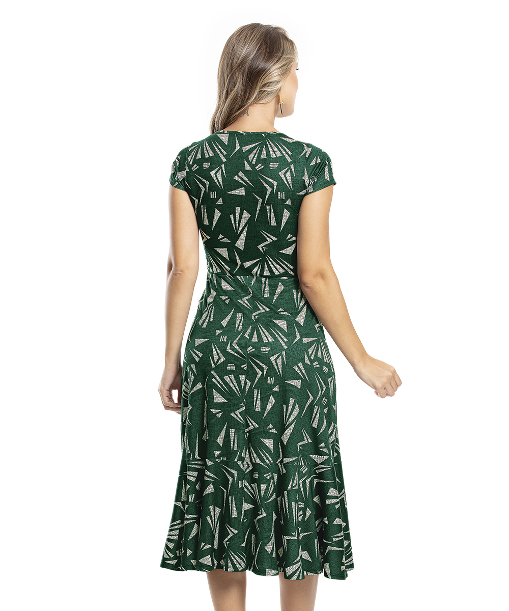 Vestido decote quadrado, busto forrado, mangas curtas. Modelagem da saia