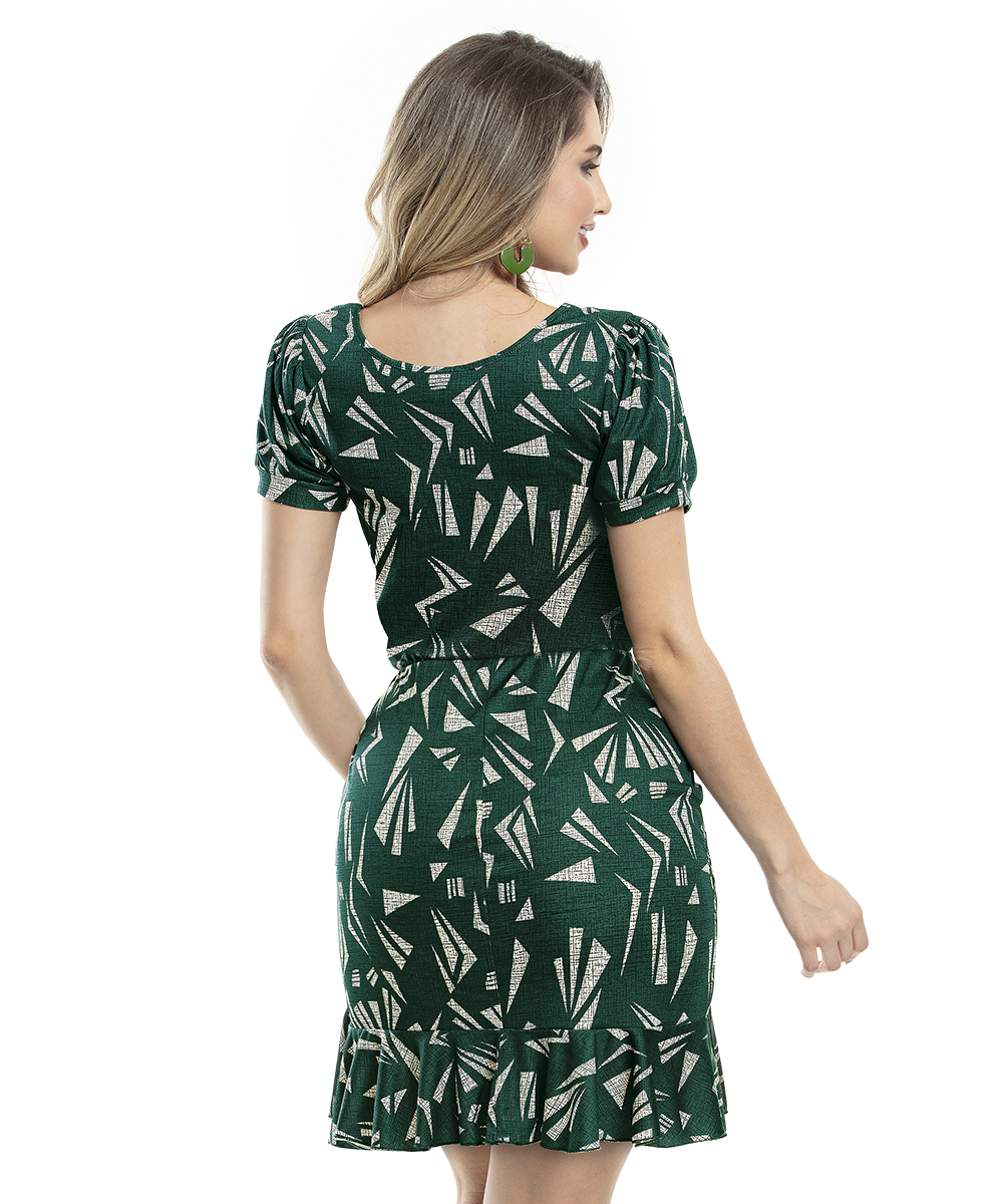 Vestido decote redondo, mangas curtas bufantes com punhos, faixa embutida