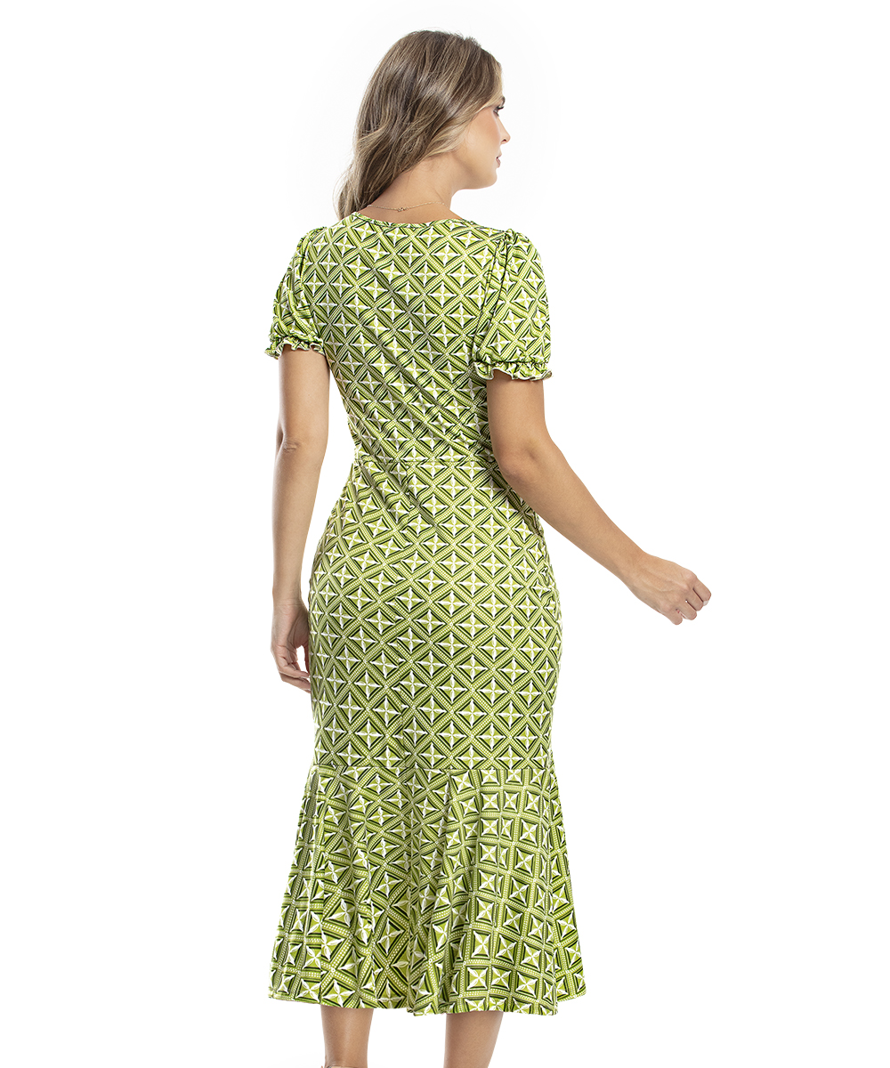 Vestido decote v, busto forrado, mangas curtas bufantes com babado, pala