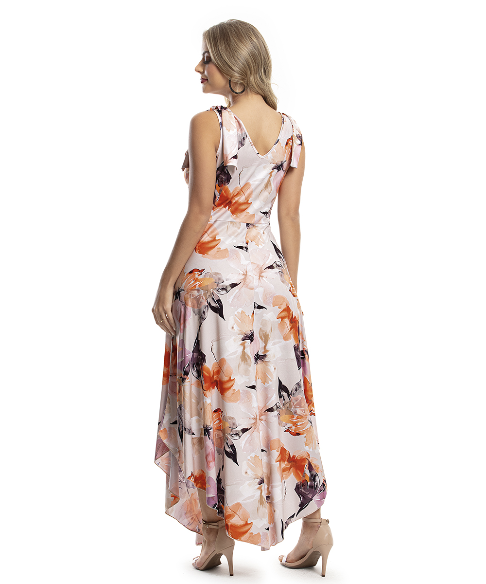 Vestido decote v, busto forrado, alças com faixa para laço, faixa embutida
