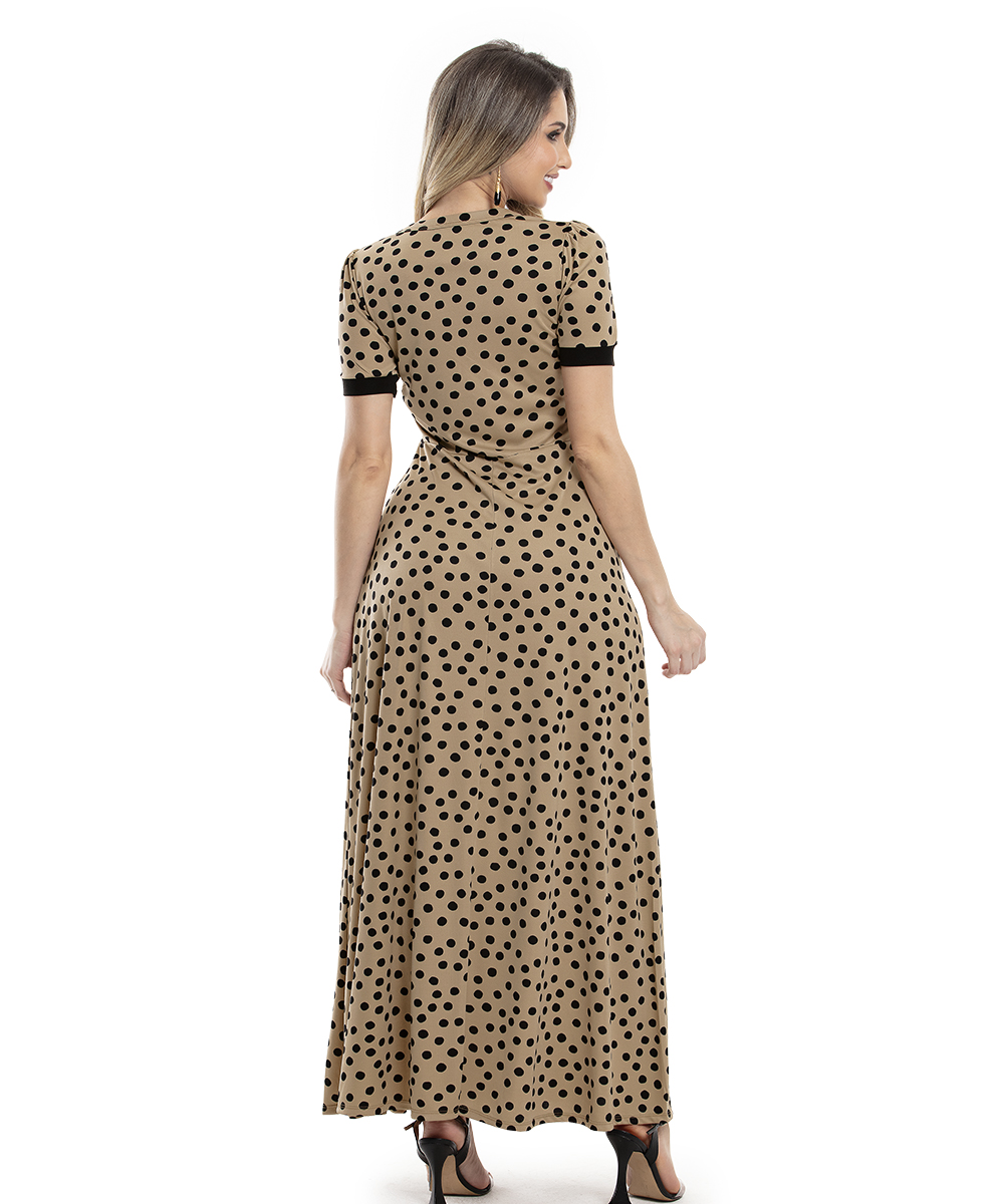Vestido decote redondo com abertura em v, mangas curtas bufantes com