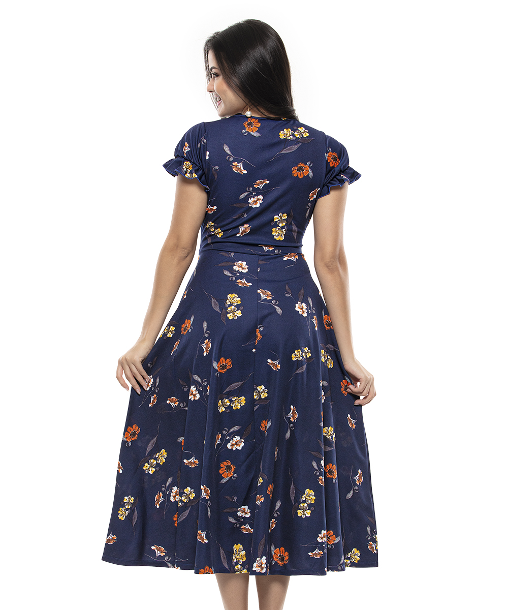 Vestido com decote v, mangas com babado delicado, detalhe de torção na