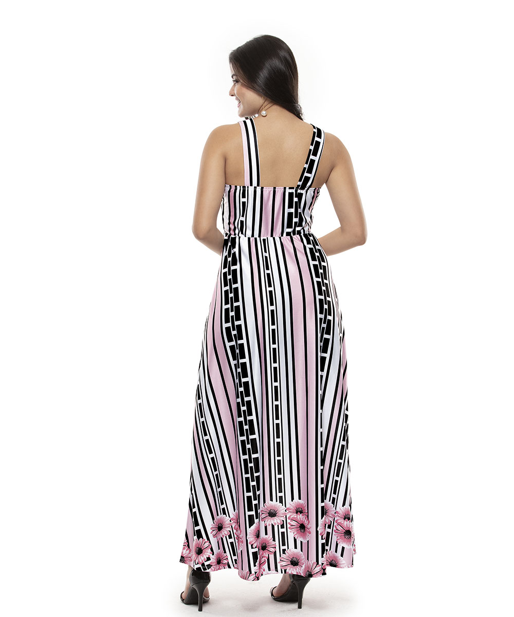 Vestido com alças largas, decote V profundo, pala abaixo do busto,