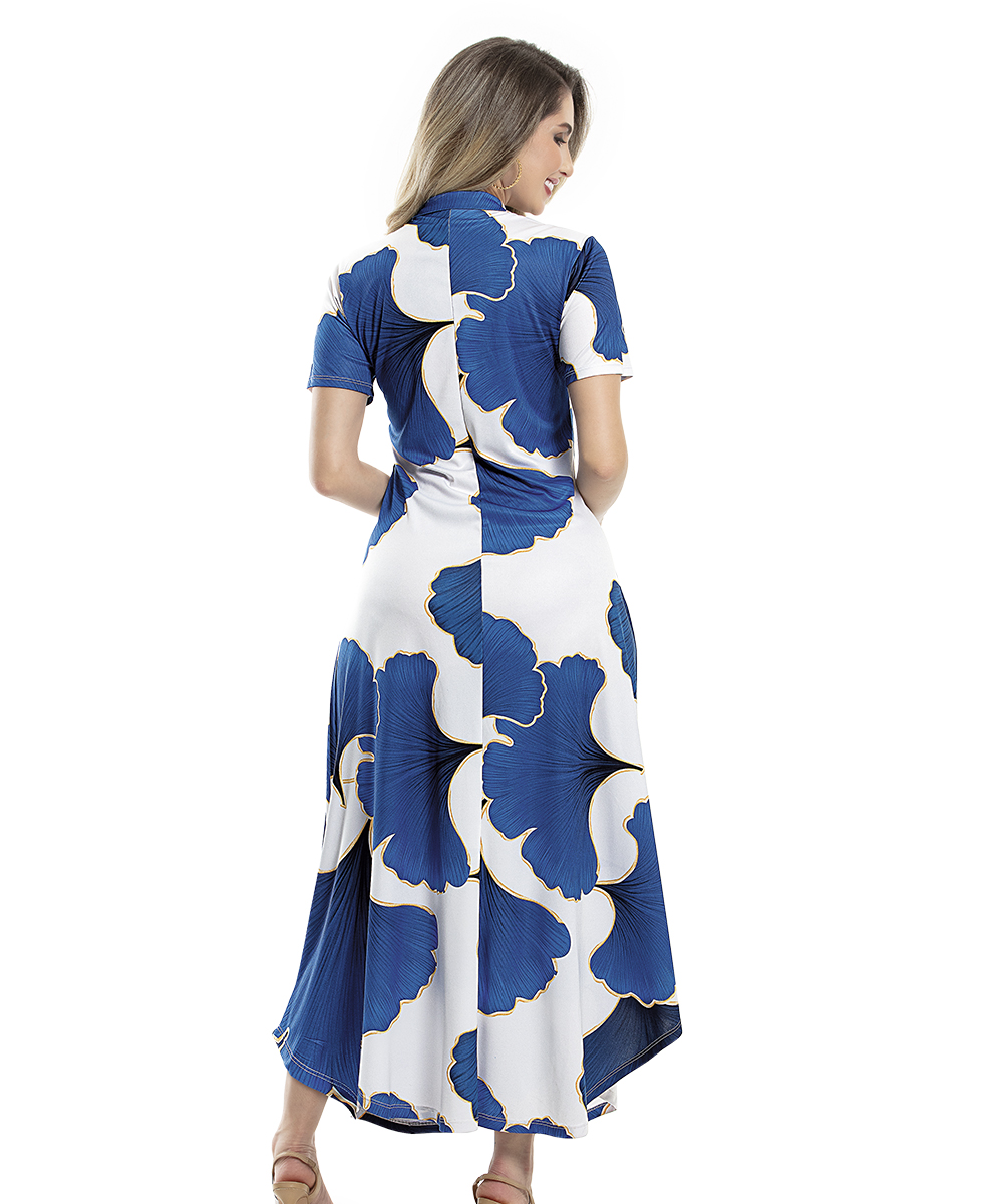 Vestido decote v com gola, mangas curtas, fechamento em botões. Modelagem