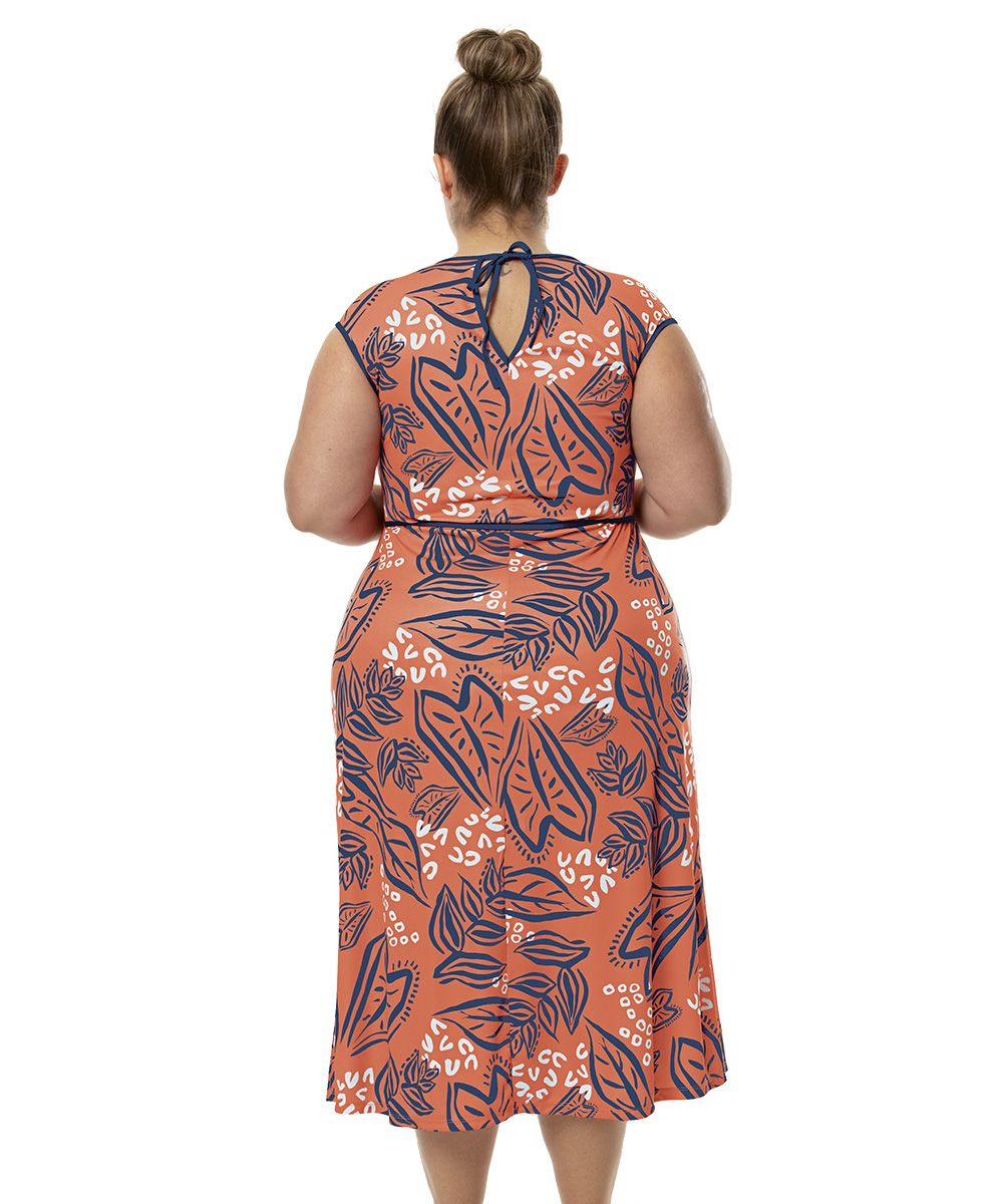 Vestido com decote redondo, mangas curtas, modelagem reta. Amarração nas