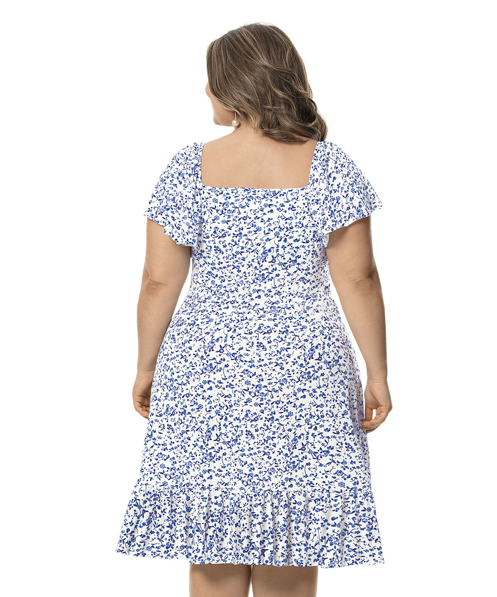 Vestido com decote coração, manga com babado, elástico nos ombros, babado