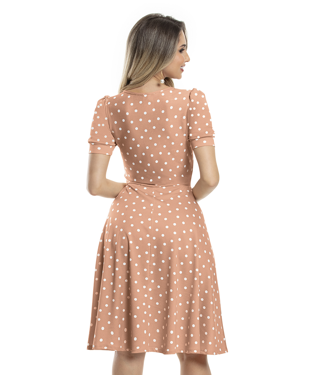 Vestido decote coração, busto forrado, mangas curtas bufantes com punhos,