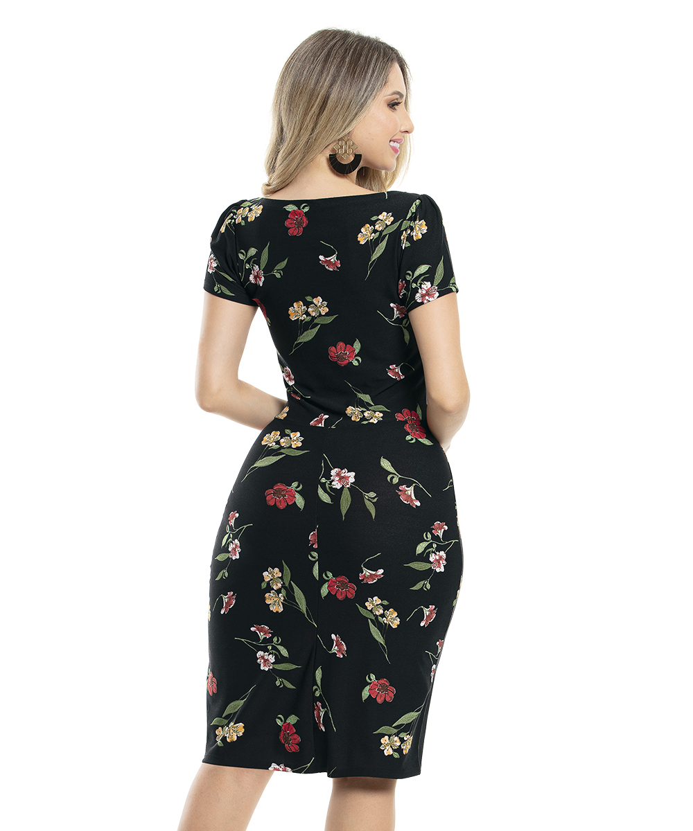 Vestido com decote canoa, mangas curtas com franzido nos ombros.
