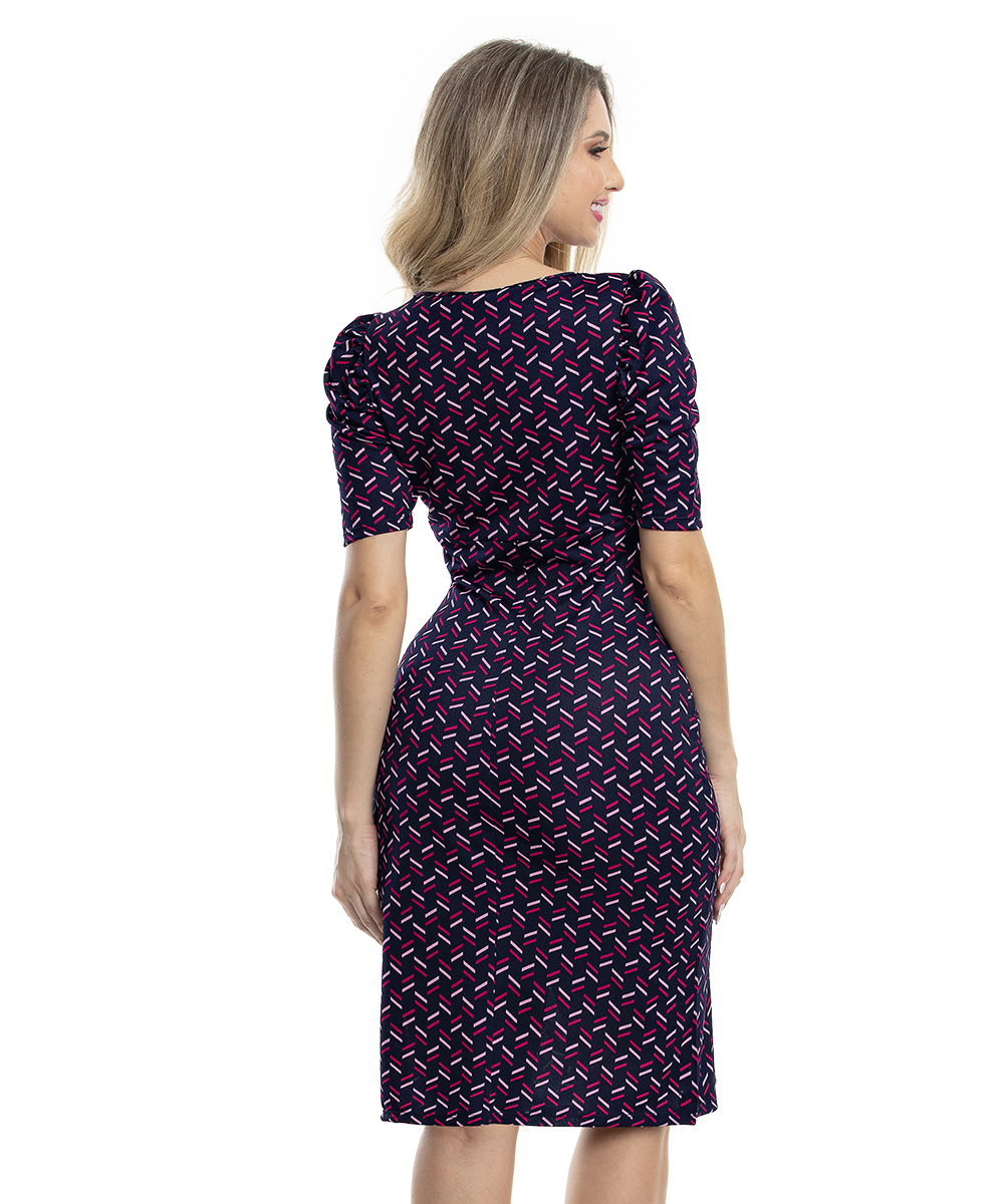 Vestido com decote v, mangas curtas bufantes, pala abaixo do busto.