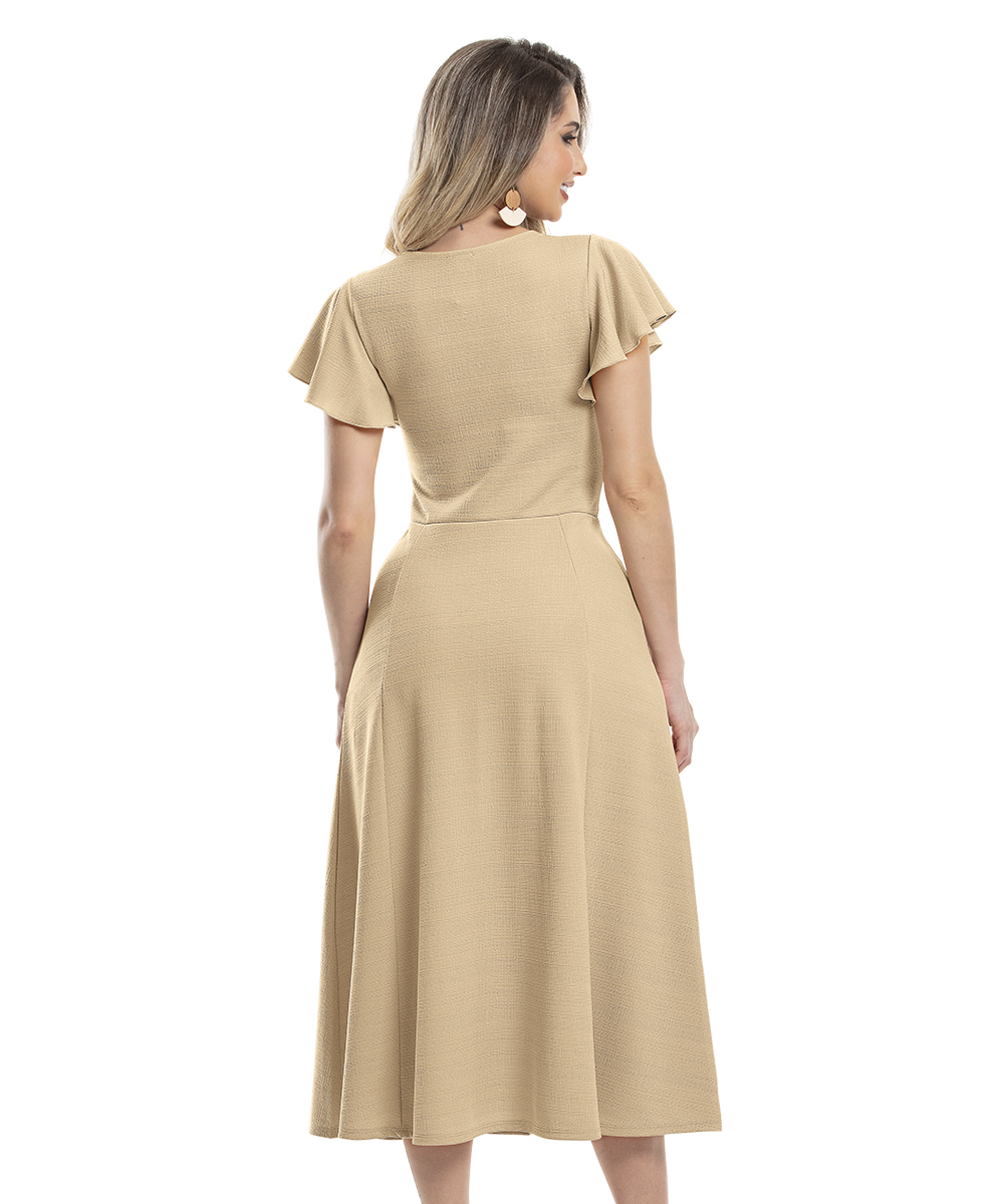 Vestido decote v, busto forrado, mangas curtas godês, pala na cintura,