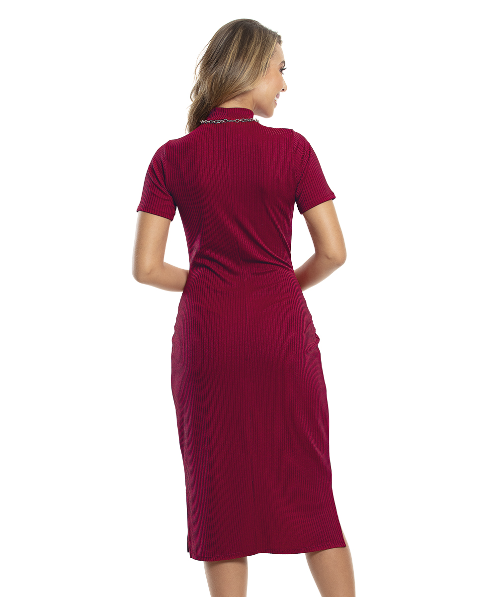 Vestido com decote alto redondo, mangas curtas, fendas laterais.