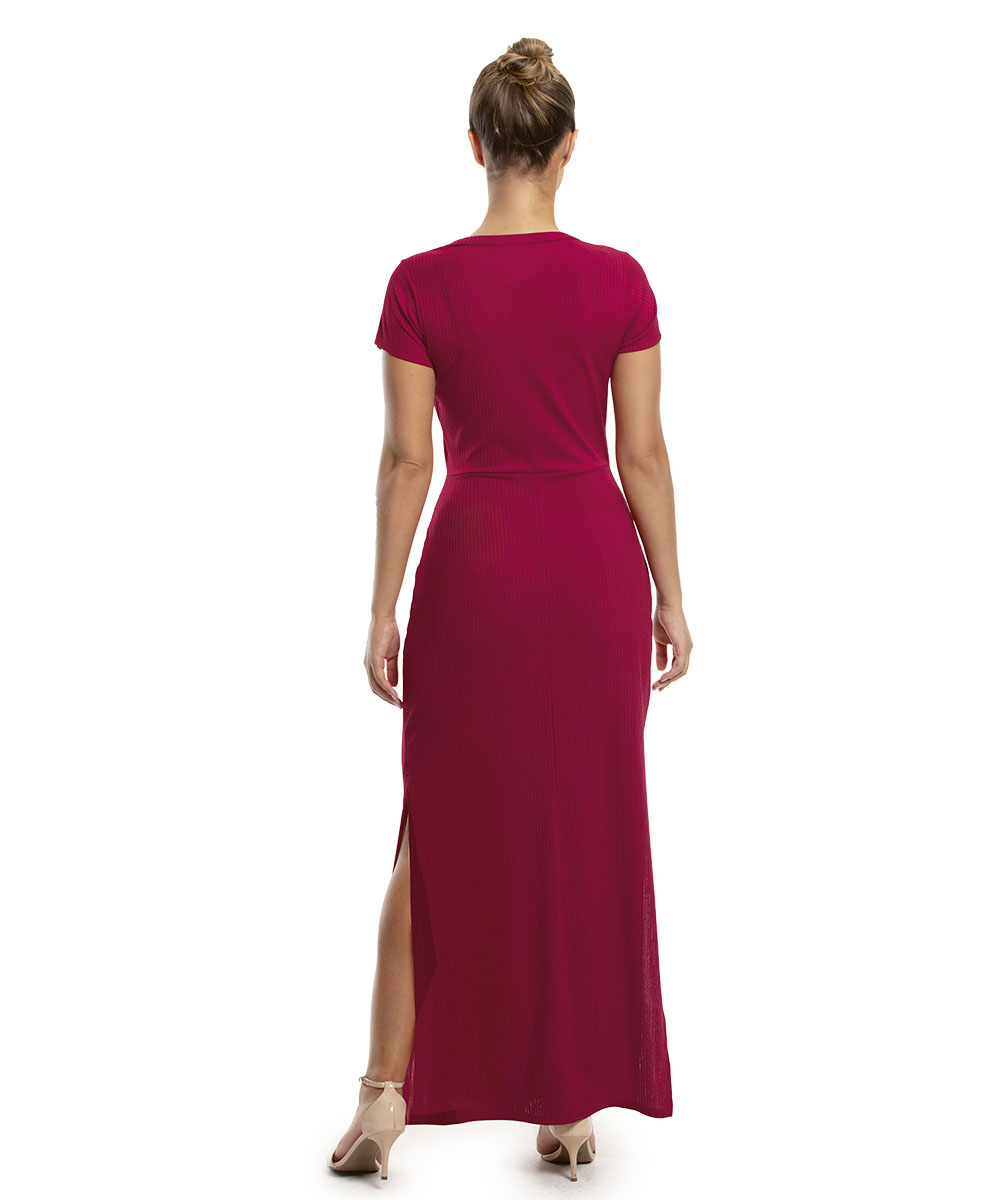 Vestido decote redondo com abertura discreta, botões decorativos, mangas