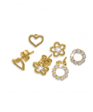 Conjunto com 3 pares de Brincos Romântico Folheados a ouro com strass