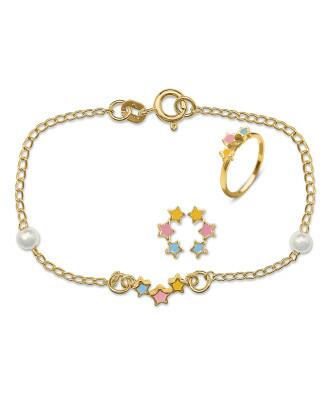 Conjunto de Brincos, Pulseira e Anel Estrelas Folheados a ouro com resina