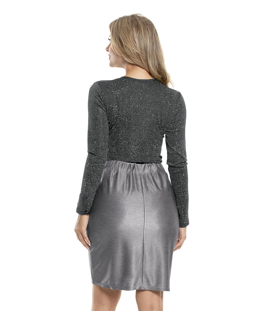 Malha com brilho e elastano. Tecido leve e com ótimo caimento