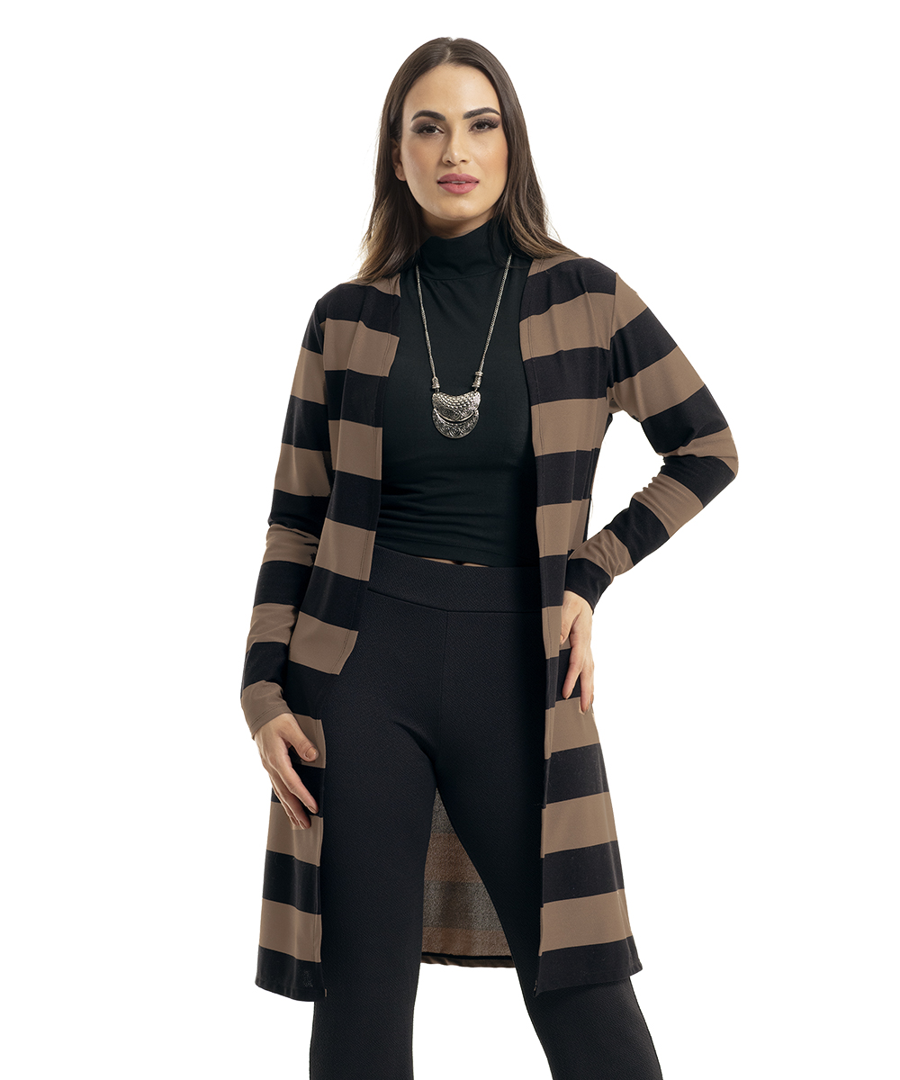 Casaco aberto alongado feito em malha crepe, confortável e prático ao mesmo tempo.