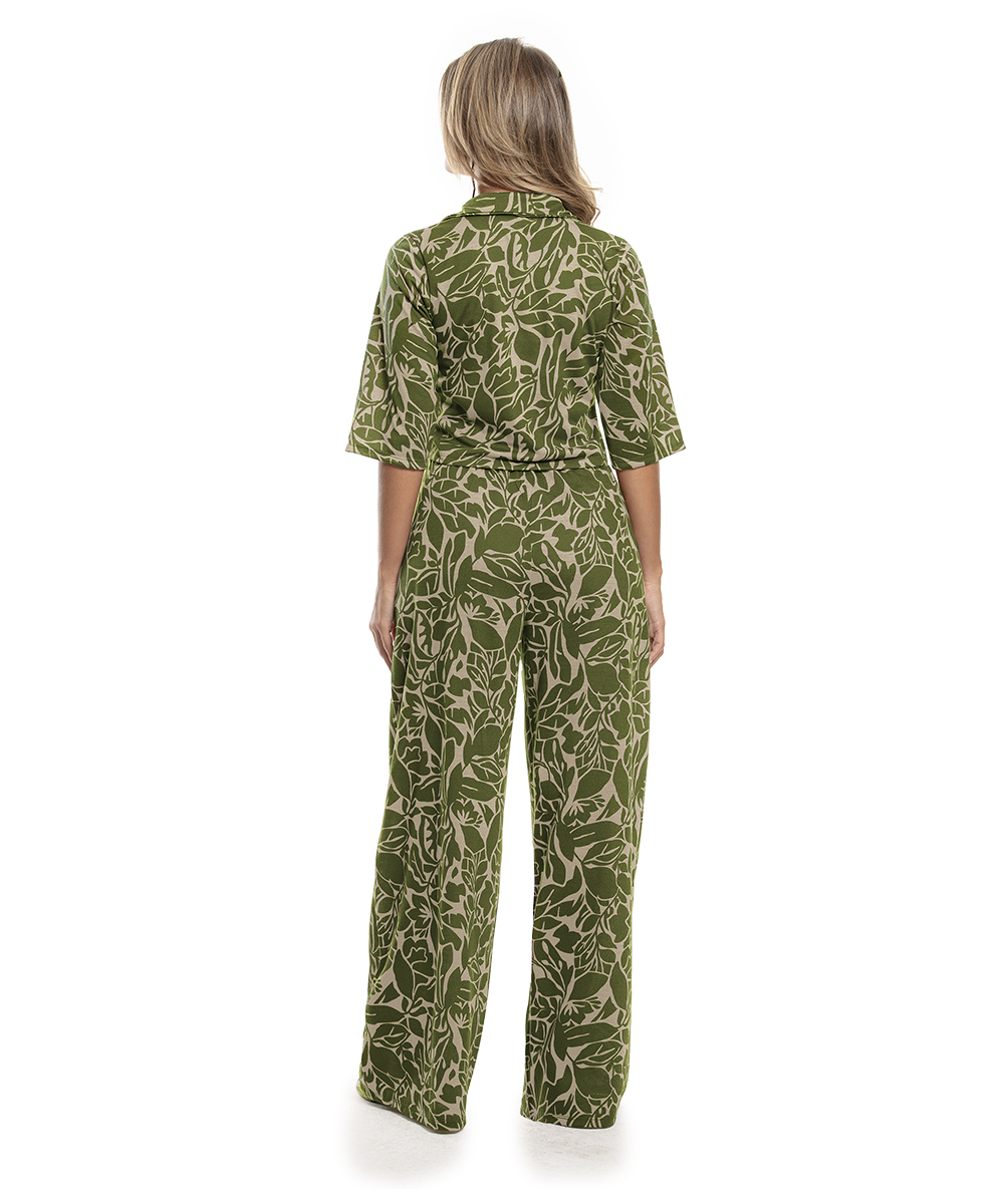Camisa com gola, fechamento com botões, mangas na dobra do braço . Calça com cós frontal e elástico traseiro. Modelagem da calça pantalona.