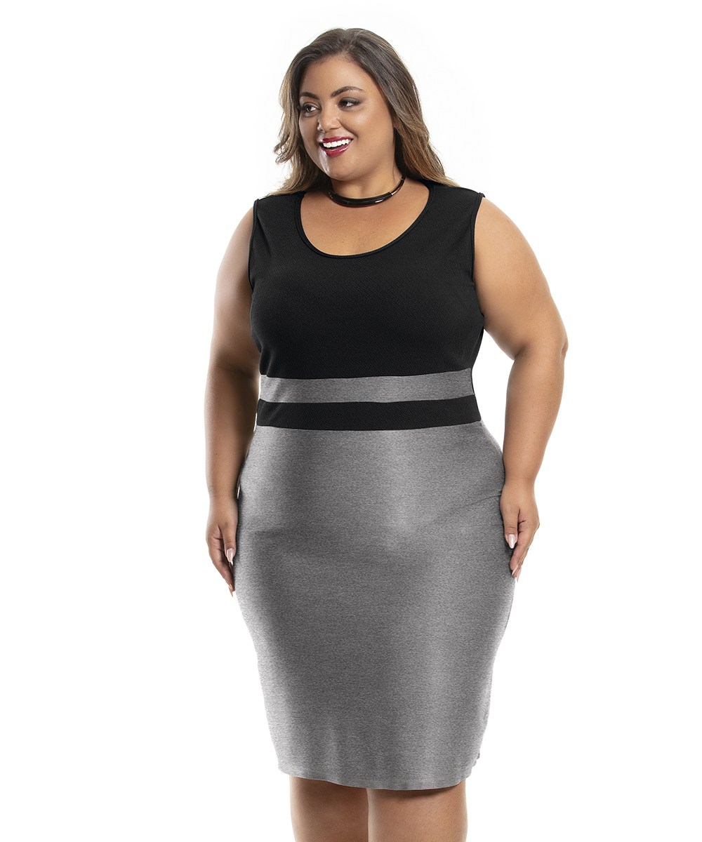 O vestido possui um decote redondo e sem mangas, realçado por uma faixa contrastante que adiciona um toque moderno à peça. Modelagem da saia reta, que valoriza a silhueta.