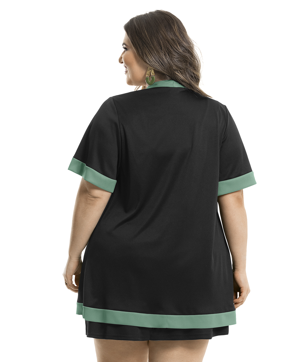 Kimono com detalhes cor verde contrastante, mangas no comprimento na dobra do braço. Macaquinho com alças largas, ideal para usar com soutien, decote princesa, elástico na cintura e short modelagem soltinha ao corpo