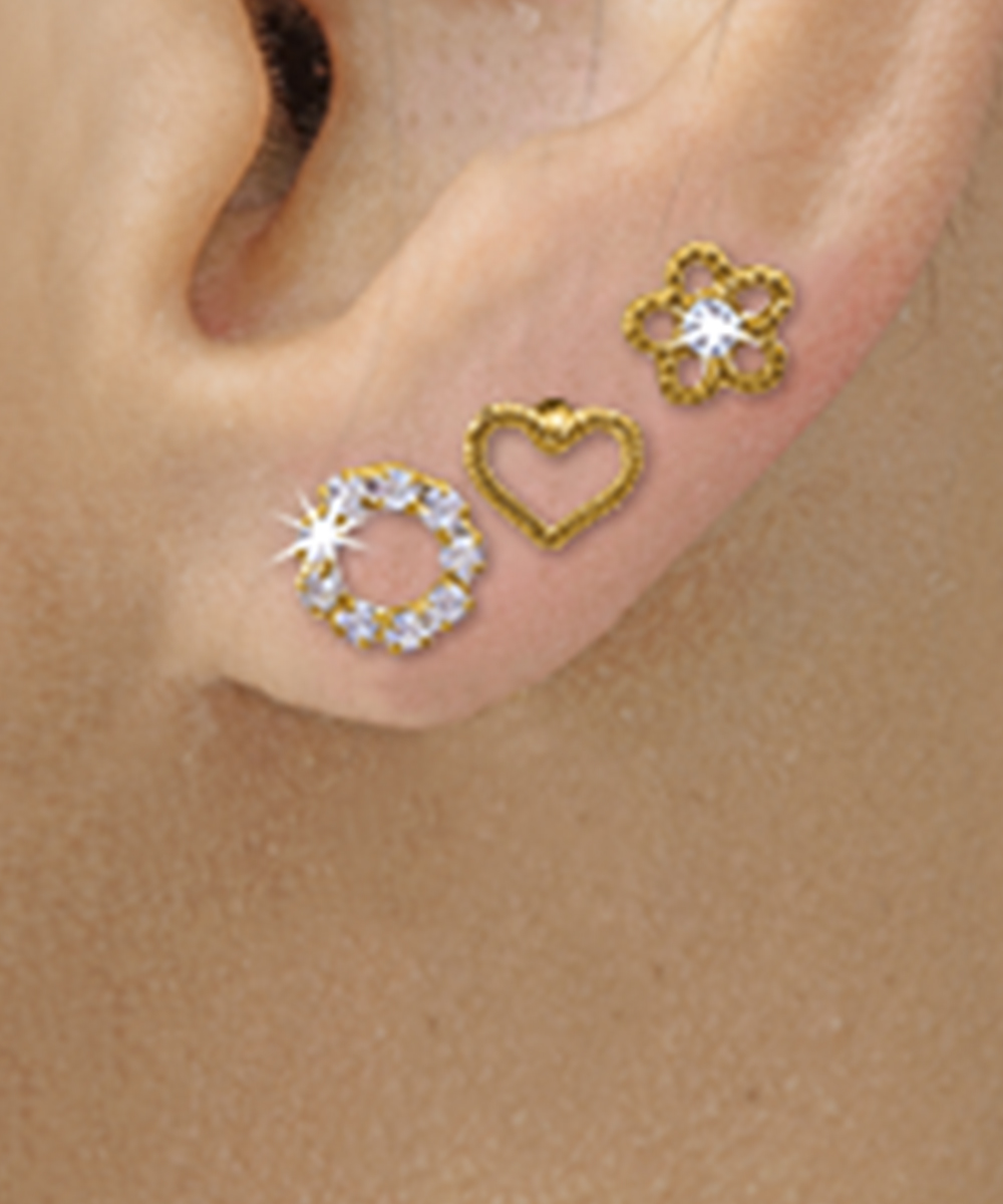 Conjunto com 3 pares de Brincos Romântico Folheados a ouro com strass