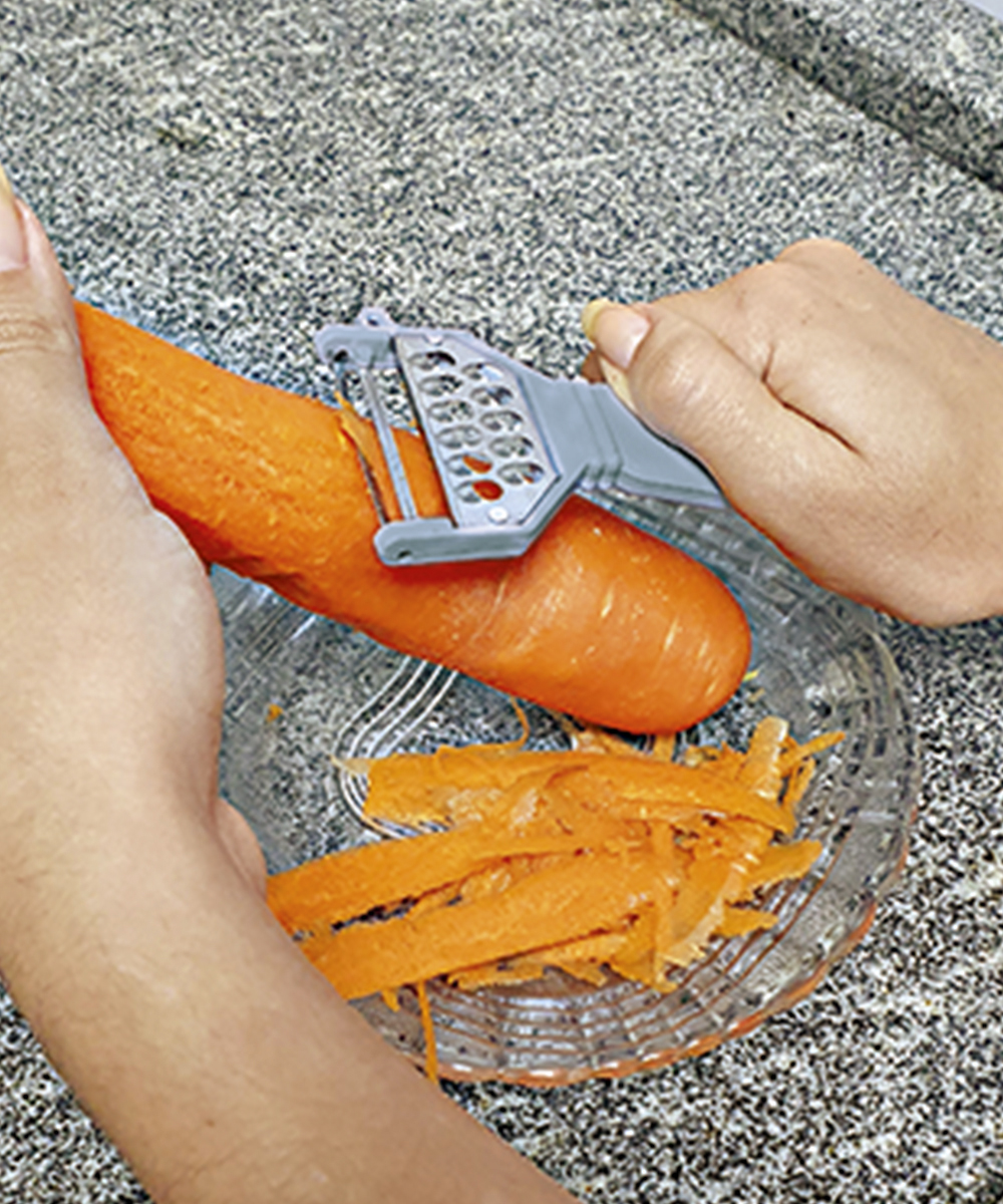 Descascador e desfiador de legumes com lâmina em metal