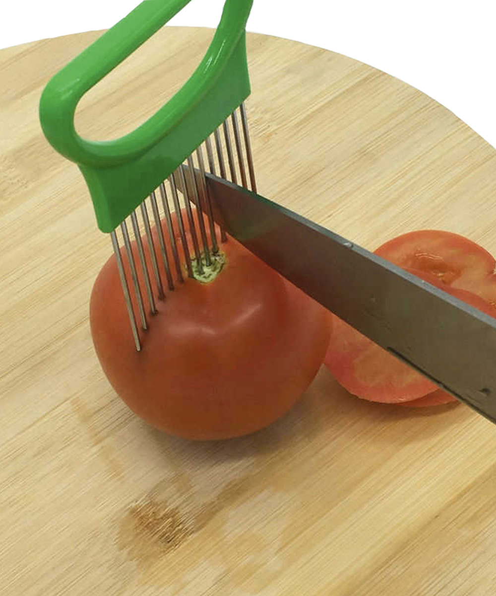Auxilia no corte em fatias de alimentos como cebola, tomate, batata,