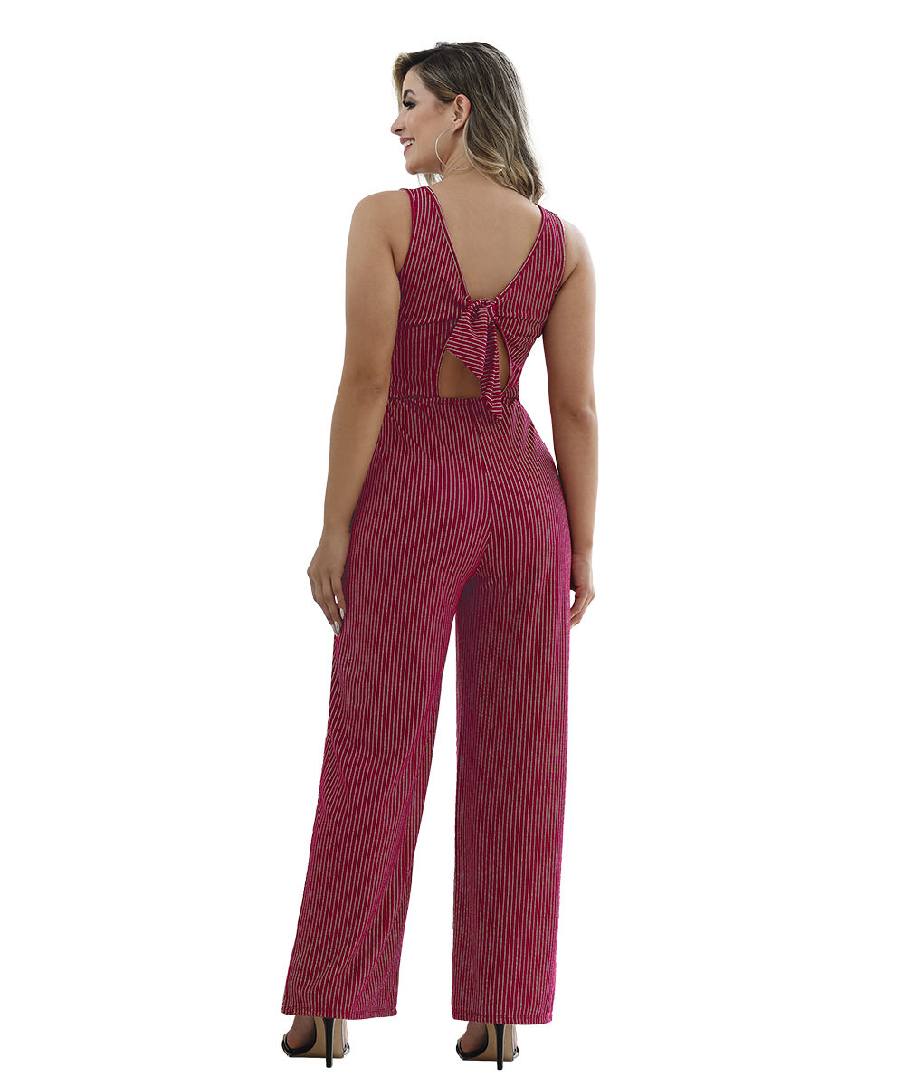 Macacão feito em jacquard light risca de giz com decote em V, argola na cintura, modelagem da calça reta, possui abertura nas costas com faixa embutida para amarração.