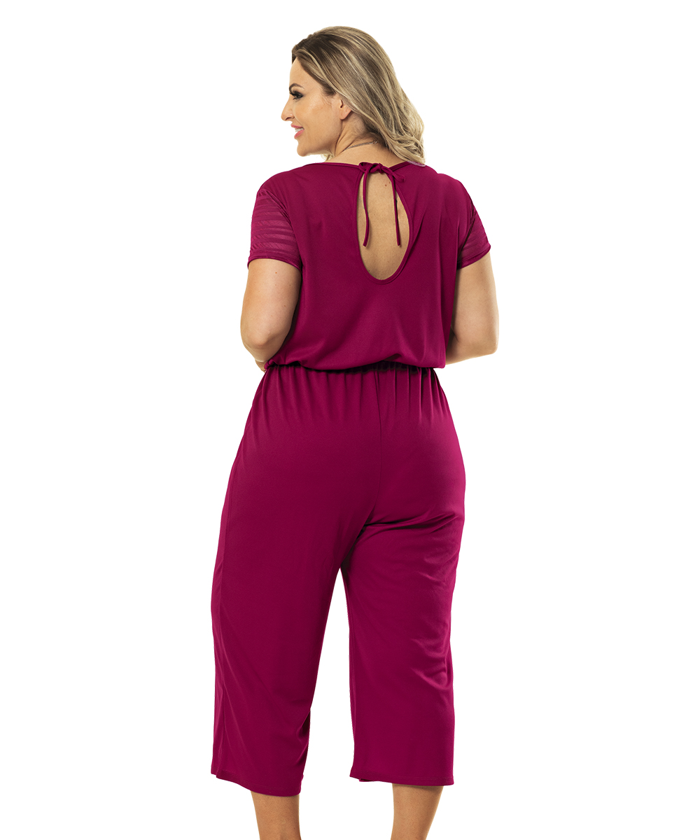 Macacão pantacourt em helanca e malha listrada em poliéster
