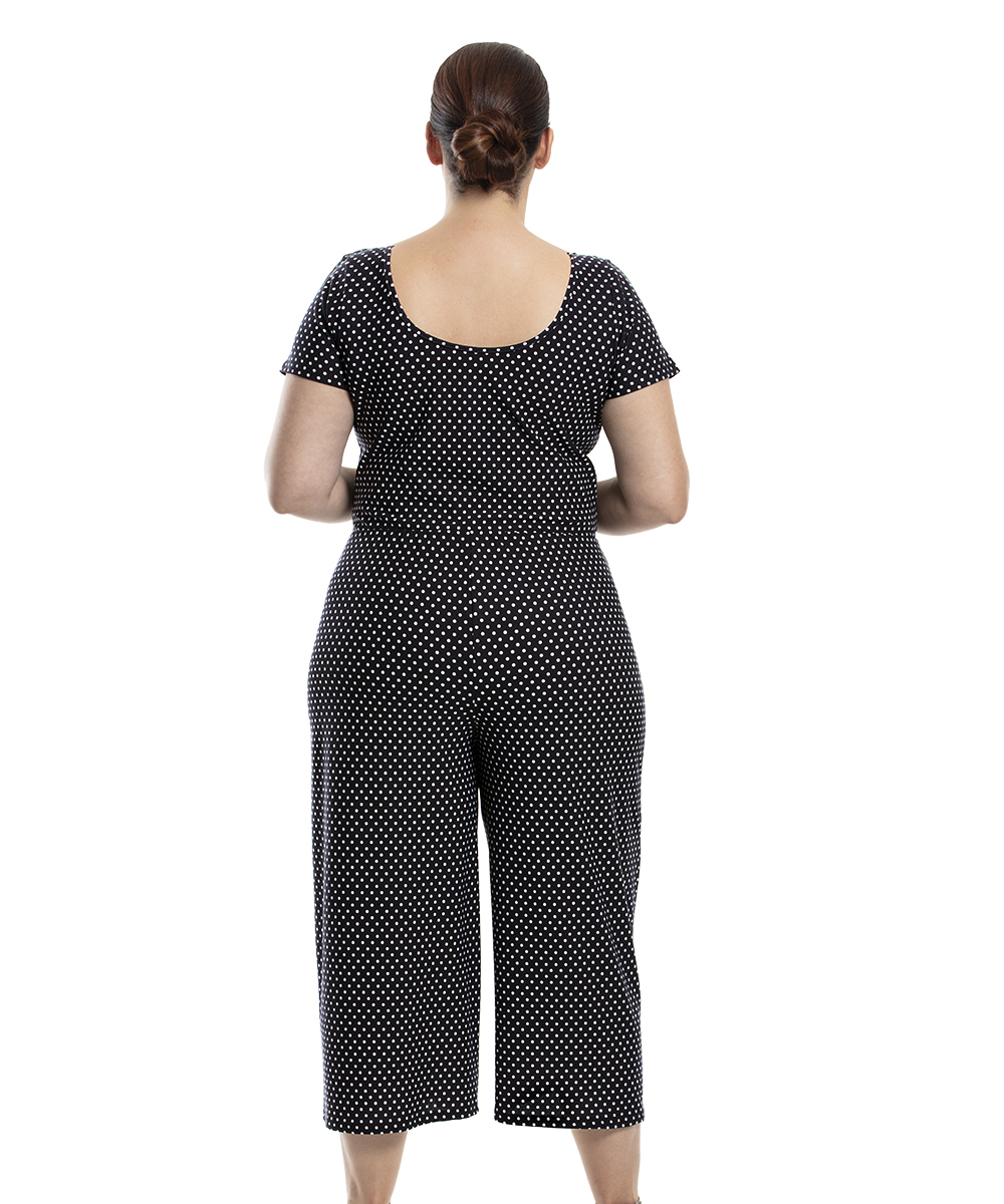 Macacão decote canoa, mangas curtas, decote redondo nas costas. Modelagem