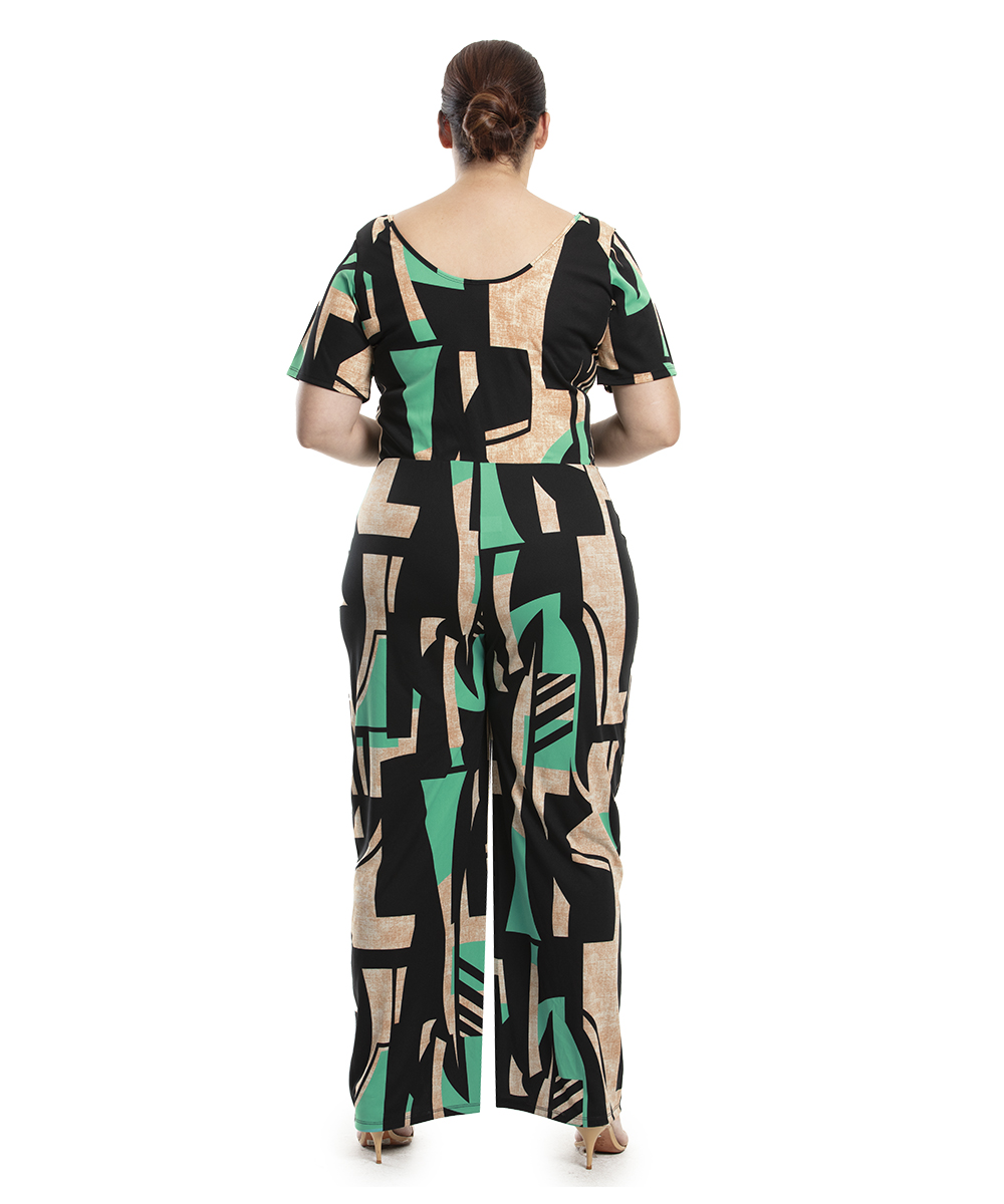 Macacão decote v, mangas curtas, costas com decote u. Modelagem da calça