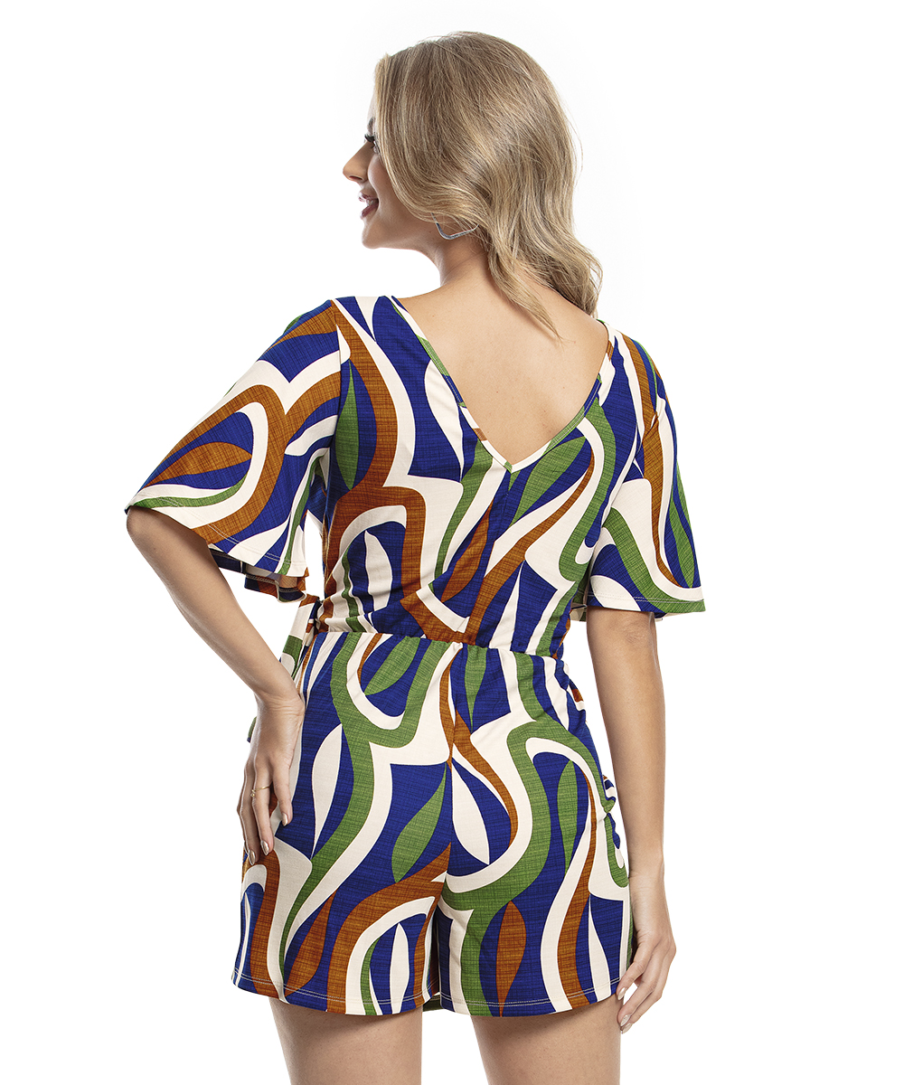 Macaquinho com decote transpassado, mangas godês, faixa embutida para