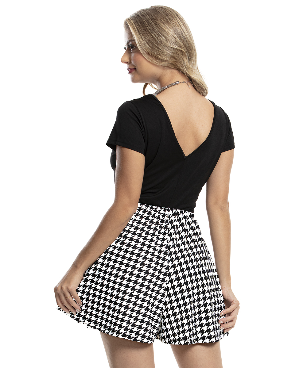 Macaquinho com decote arredondado, mangas curtas, pala na cintura, faixa
