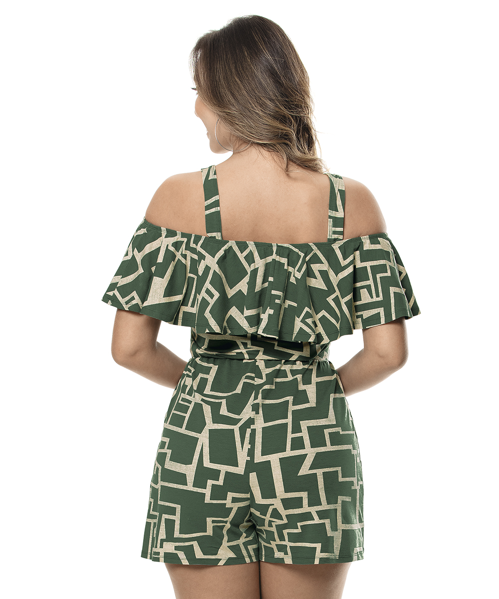 Prático e estiloso, esse macaquinho modelo ciganinha com estampa moderna é uma peça super versátil, pois conta com a praticidade de ser uma peça única e as várias possibilidades de composição de looks, seja com tênis ou sandália.