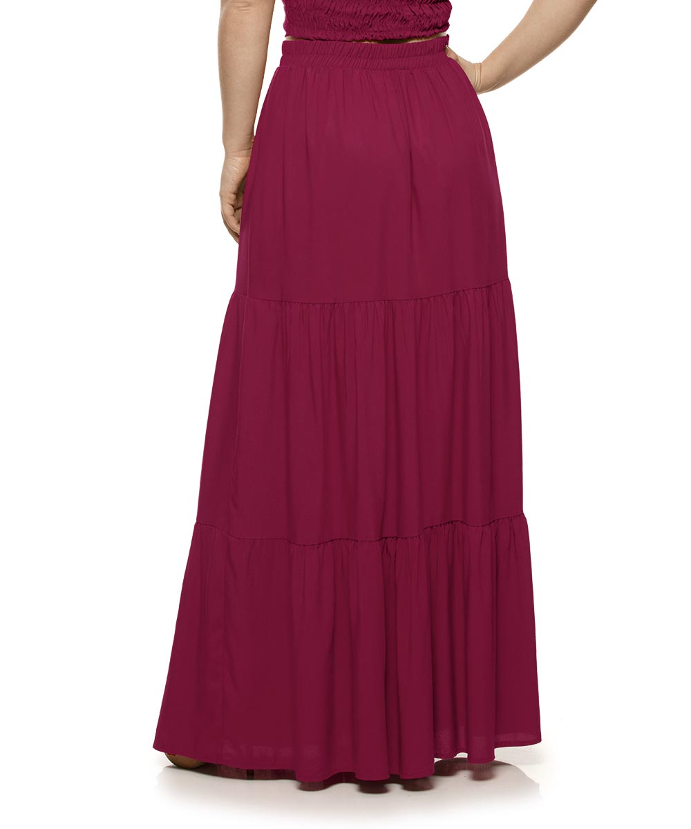 A saia possui volume em três camadas, deixando o look elegante e cheio de personalidade. Garante um movimento incrível e divertido