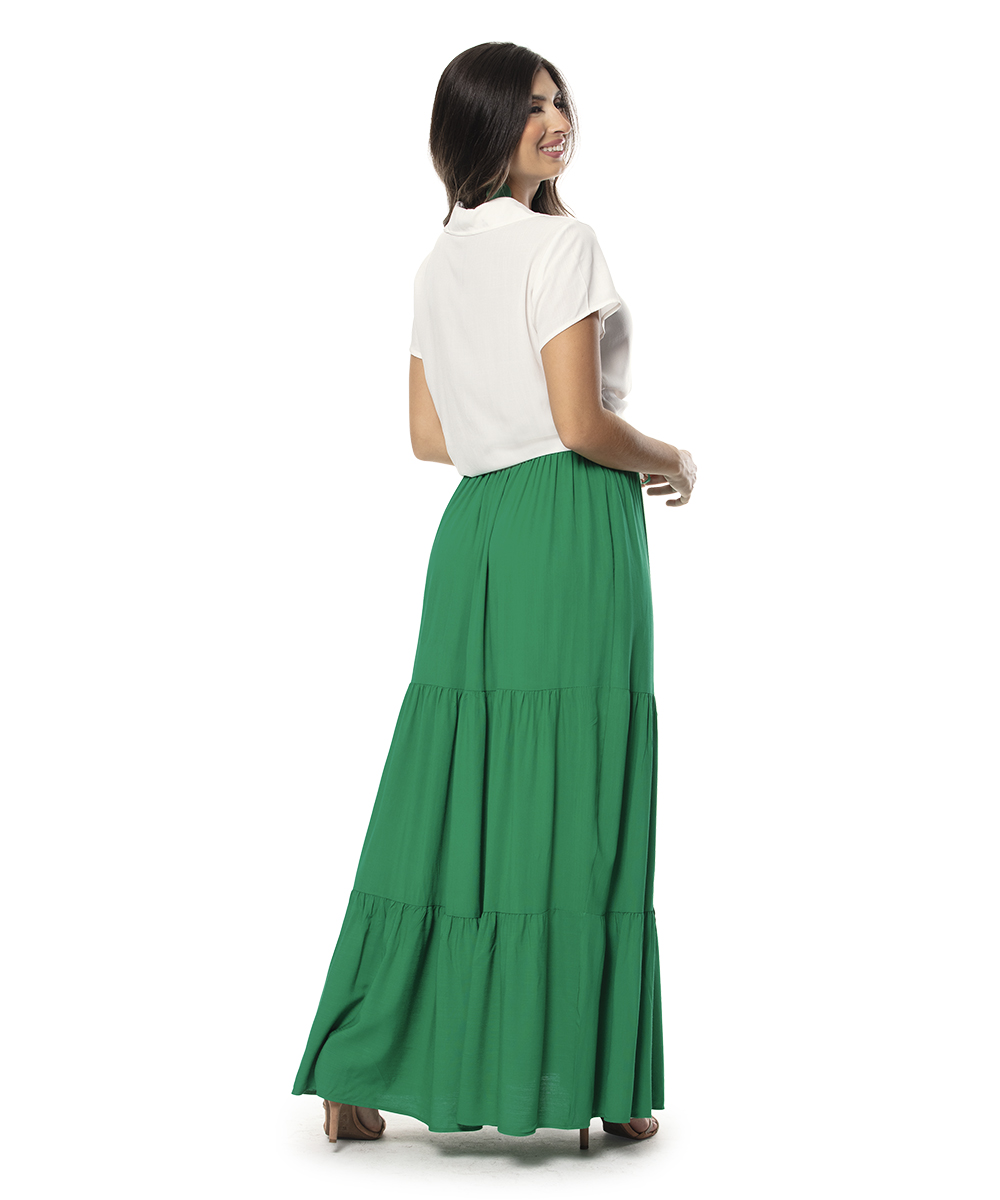 Nada melhor que uma saia longa para quem quer ser estilosa com conforto e elegância ao mesmo tempo. Combine com uma rasteira e uma linda blusa para arrasar. Feita em viscose com elástico na cintura, possui faixa embutida com ponteiras e modelagem com babados franzidos.