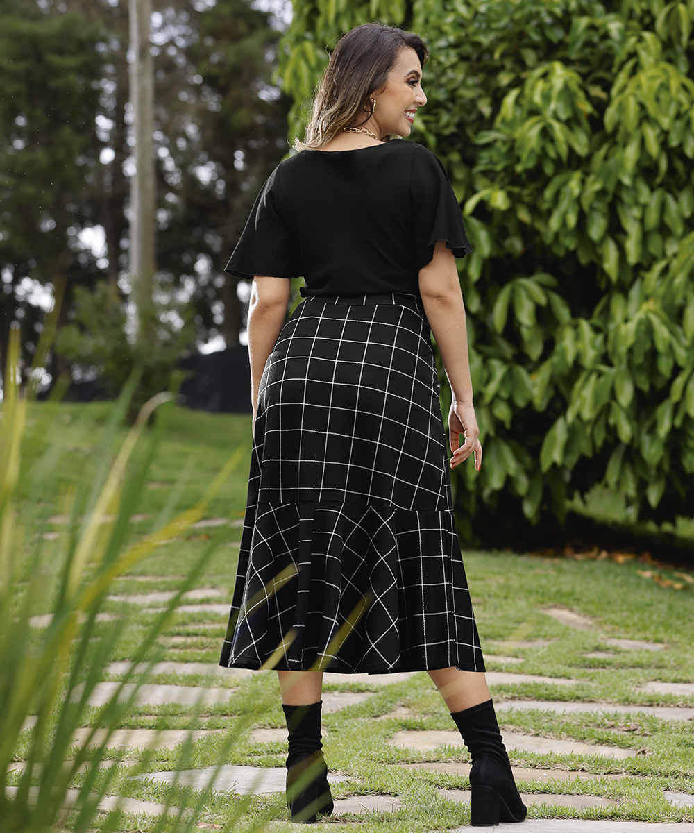 Aquele xadrez clássico, nesta saia midi com uma modelagem que valoriza qualquer silhueta.
