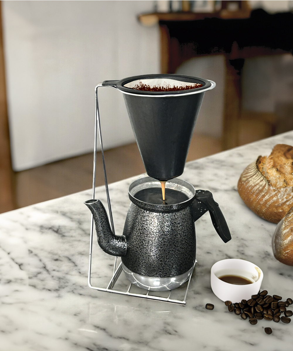 Suporte em arame cromado com porta-filtro de café em plástico