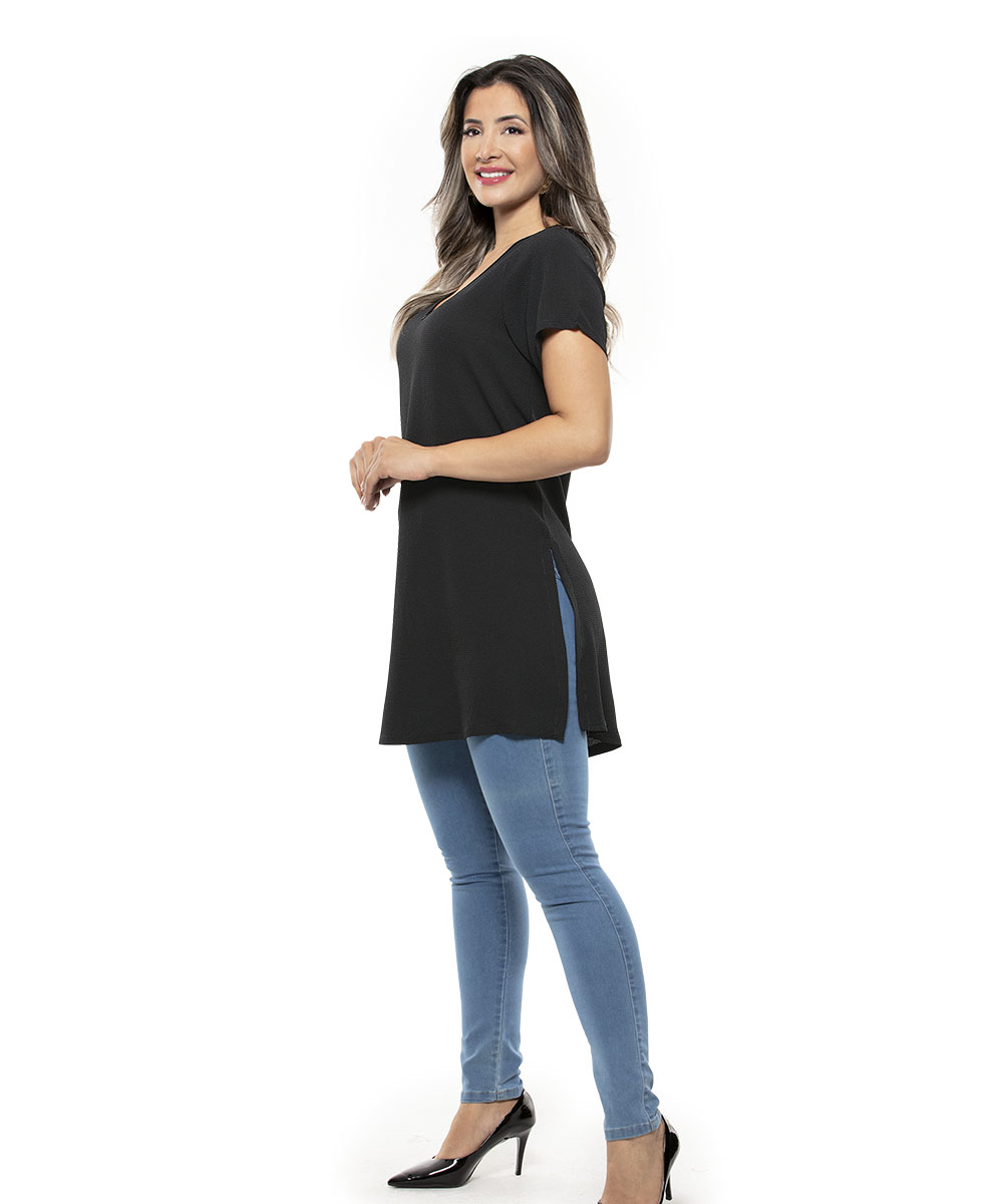 Blusa longa com decote V, mangas curtas e fendas nas laterais.