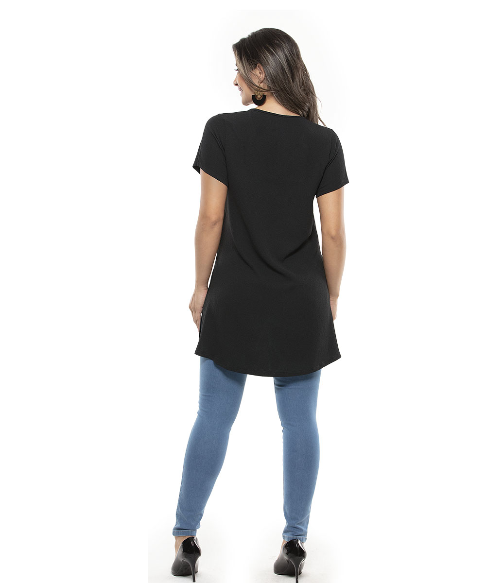 Túnica preta é um item indispensável no guarda-roupa. Esse modelo conta com o diferencial de ser feita em tecido plano crepe, com caimento perfeito para todos os estilos. Use e abuse dos acessórios para compor um look de arrasar!