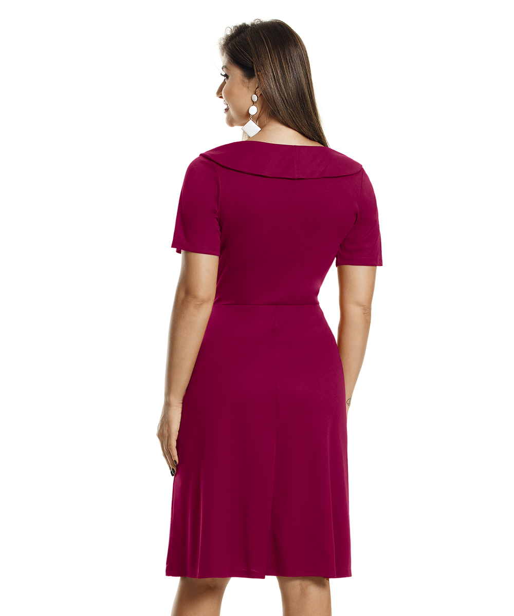 Vestido em helanca com gola e transpasse, mangas curtas, faixa embutida para laço e modelagem saia evasê. Comprimento Clássico.