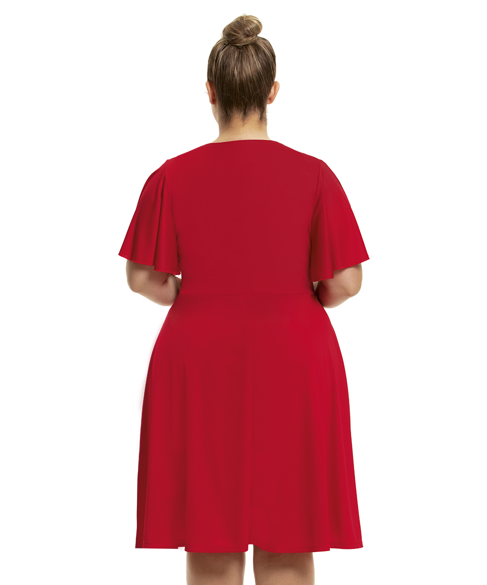 Vestido possui um leve drapeado, mangas godê e modelagem da saia godê. Comprimento Clássico.